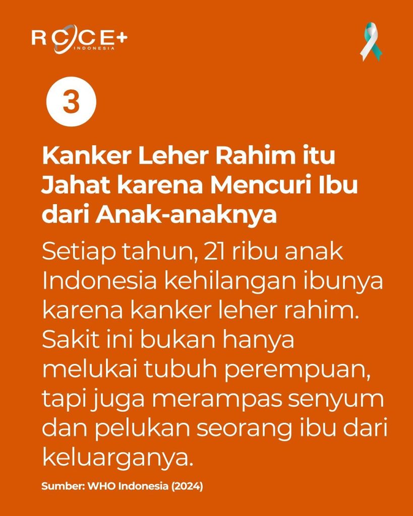 Setiap tahun, ribuan perempuan Indonesia jadi korban kanker leher rahim. Penyakit ini datang diam-diam, merenggut nyawa di usia produktif, dan meninggalkan anak-anak tanpa ibu. Cegah kanker leher rahim dengan imunisasi HPV sejak dini dan pemeriksaan leher rahim segera.